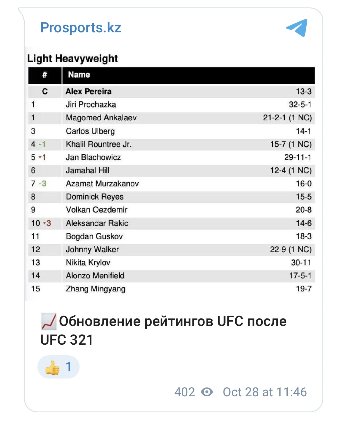 Жаңартылған рейтингте жеңіліп көрмеген ресейлік файтер үш сатыға көтеріліп, жетінші орынға жайғасты.