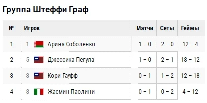 Штеффи Графтың тобына Арина Соболенко, Джессика Пегула, Кори Гауфф және Жасмин Паолини кіреді.