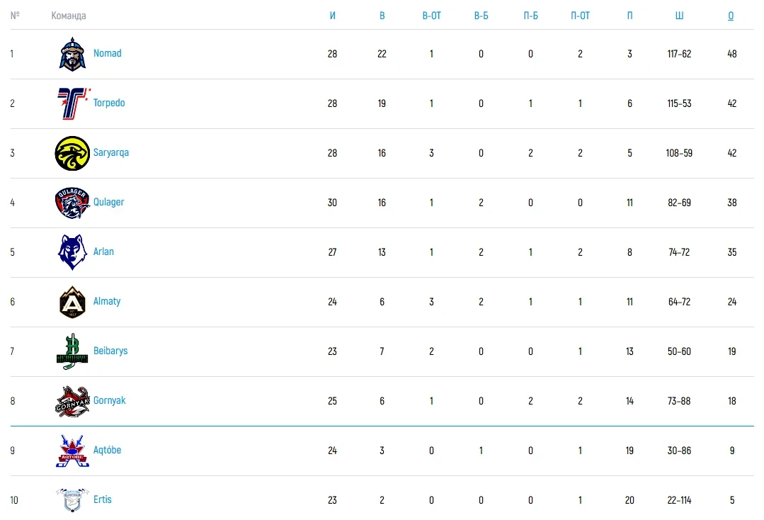 Pro Hokey League: 20 қарашадағы командалық турнирлік кесте