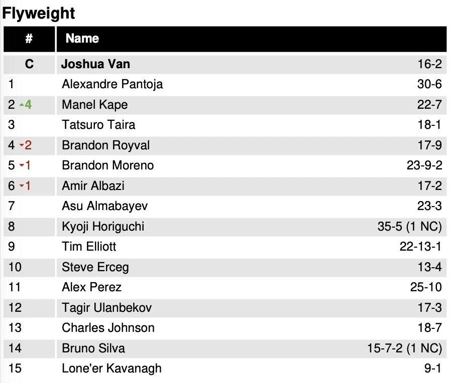 Бұрынғы екінші орын иесі Брэндон Ройвал төртінші орынға түсті. Брэндон Морено мен Амир Альбази әрқайсысы бір сатыға төмендеді, сәйкесінше бесінші және алтыншы орынға жайғасты.