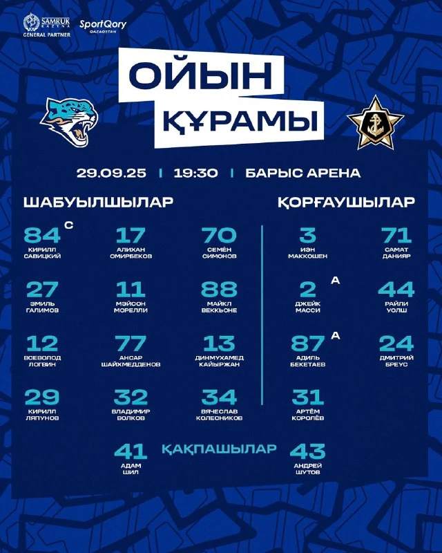 «Барыс» представил состав на матч против «Адмирала», сообщает Prosports.kz.