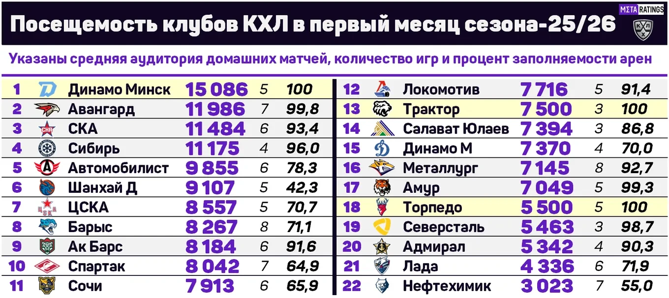 Три клуба КХЛ показывают 100-процентную посещаемость матчей – минское «Динамо», «Трактор» и «Торпедо». Минчане в среднем собирают 15086 зрителей, в топ-5 также входят «Авангард», СКА, «Сибирь» и «Автомобилист». Рейтинг посещаемости команд выглядит так: