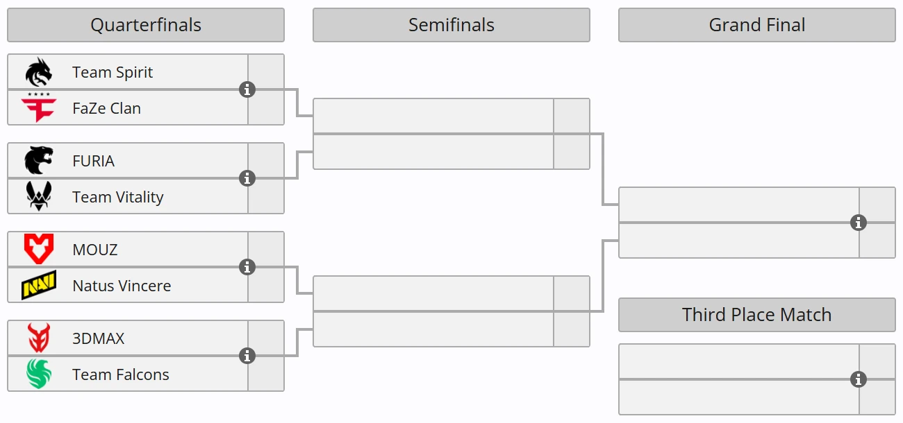 Сетка плей-офф уже определена. В первом раунде 3DMAX встретятся с Falcons, а MOUZ сыграют против NAVI. FaZe сразятся с Spirit, а действующие чемпионы Vitality — с FURIA. Матчи стартуют 10 октября.