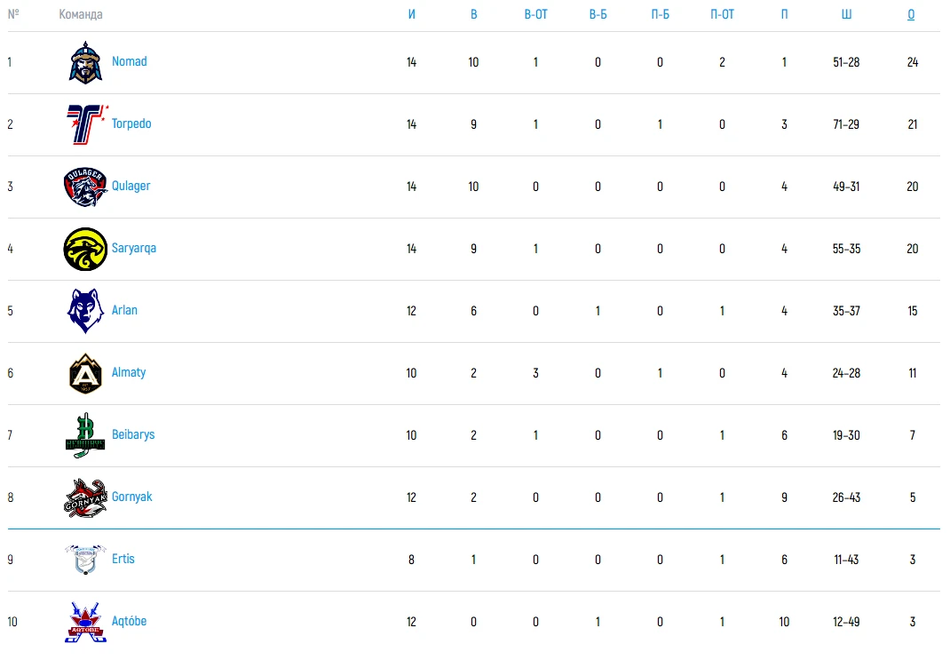 Pro Hokei Ligasy. Положение команд на 12 октября