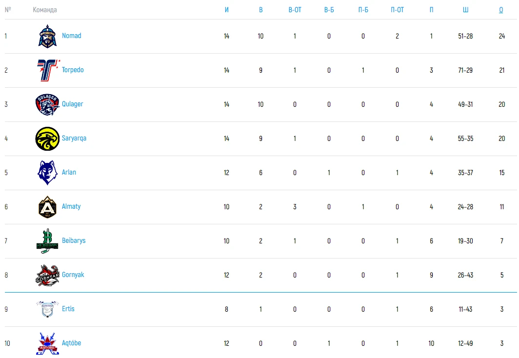 Pro Hokei Ligasy. Положение команд на 13 октября