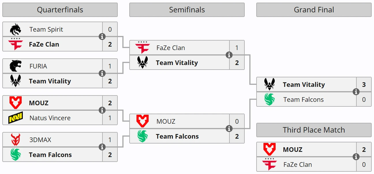 Третье место в лиге заняли MOUZ, победившие FaZe со счетом 2:0 в матче за бронзу. Для FaZe это стало последним выступлением с Ховардом rain Нюгором.