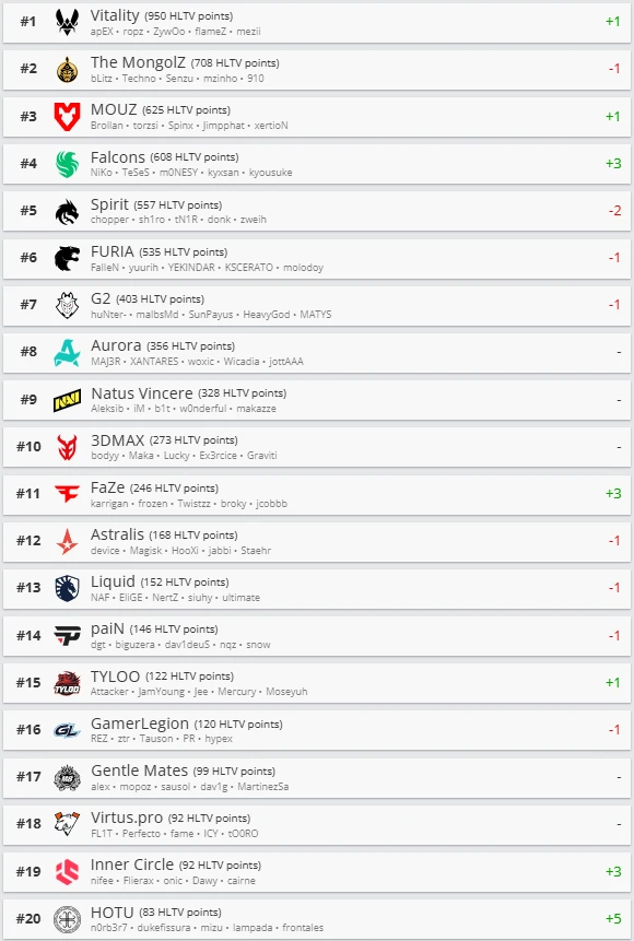 Первое место заняла Team Vitality, сместив The MongolZ, удерживавших лидерство в течение двух недель. Третью строчку заняла MOUZ, а Team Falcons поднялась на четвертую позицию, обогнав Team Spirit, которая теперь находится на пятом месте.