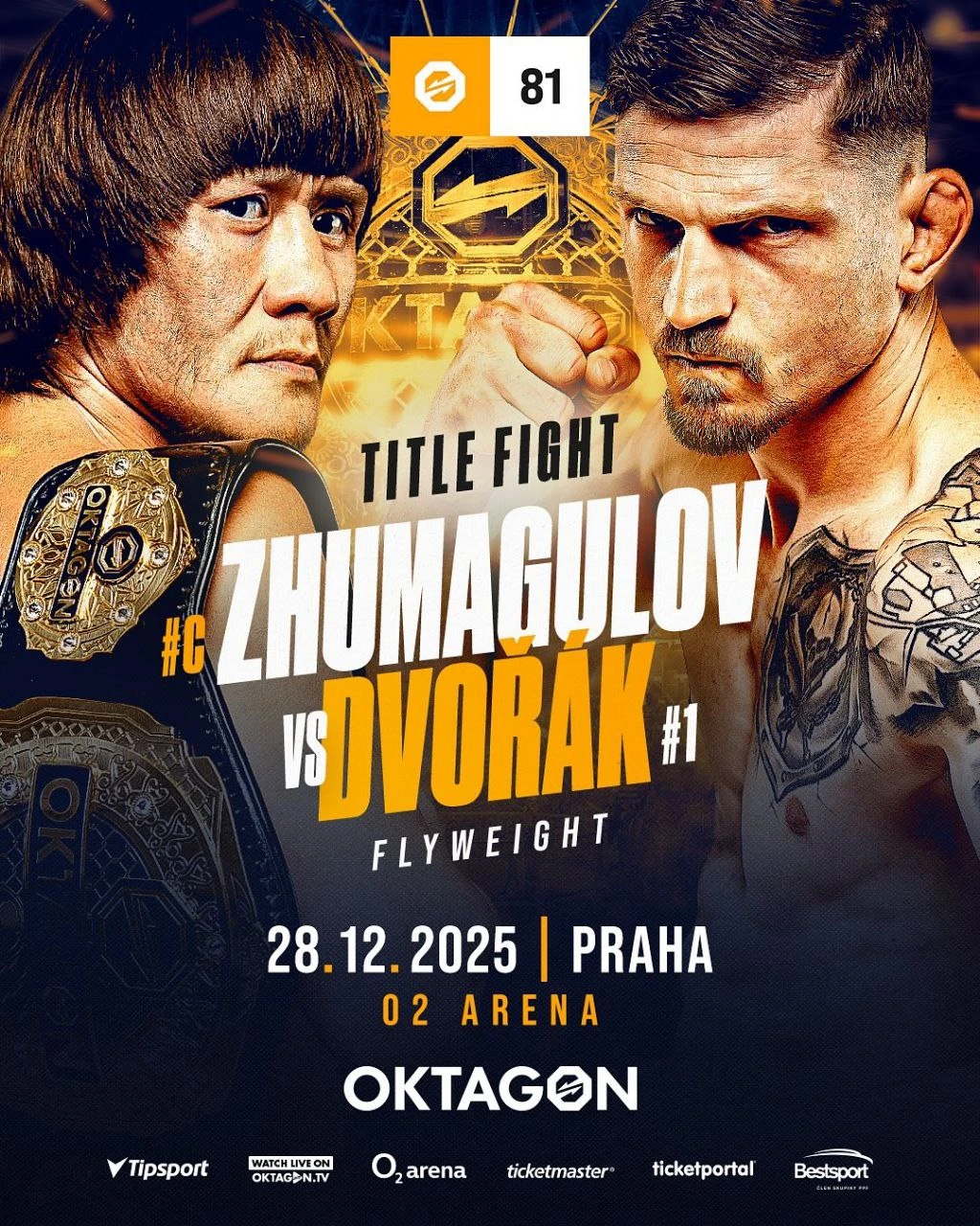 Жалгас Жумагулов (18-9) проведёт защиту титула против Давида Дворака (22-6) 28 декабря на #Oktagon81, который пройдет в столице Чехии - Праге. Для Жумагулова, одержавшего четыре победы после, того как спортсмен покинул UFC - это будет сложный экзамен, ведь арена О2 вмещает 20000 зрителей, которые будут неистово болеть за местного бойца.