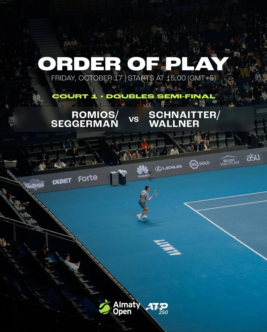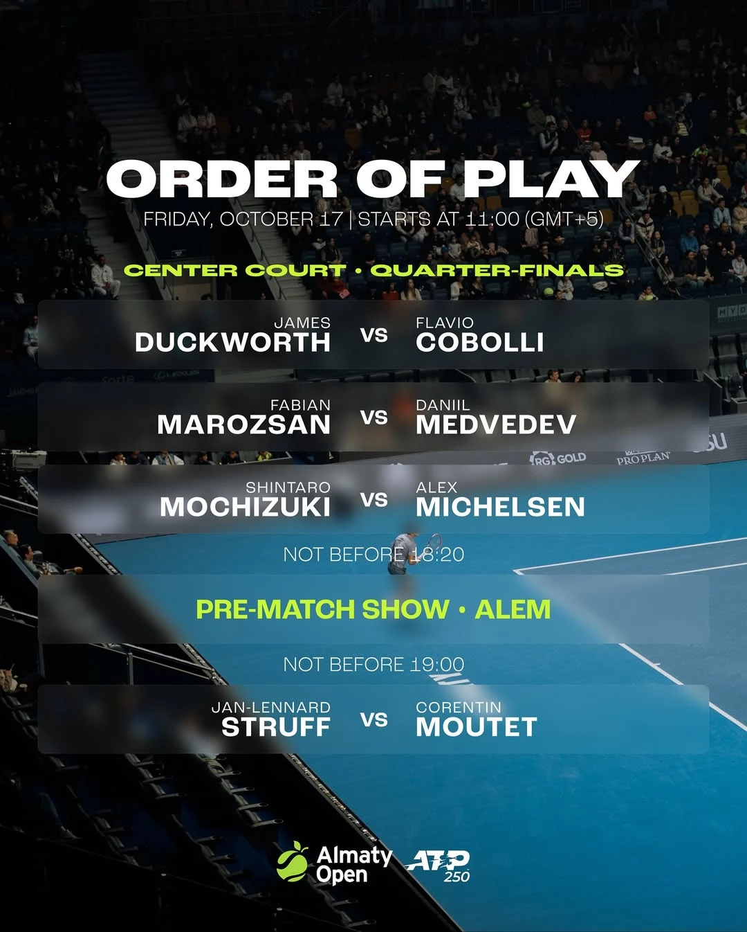 Almaty Open пройдет с 11 по 19 октября. Призовой фонд турнира 1 055 255 долларов.