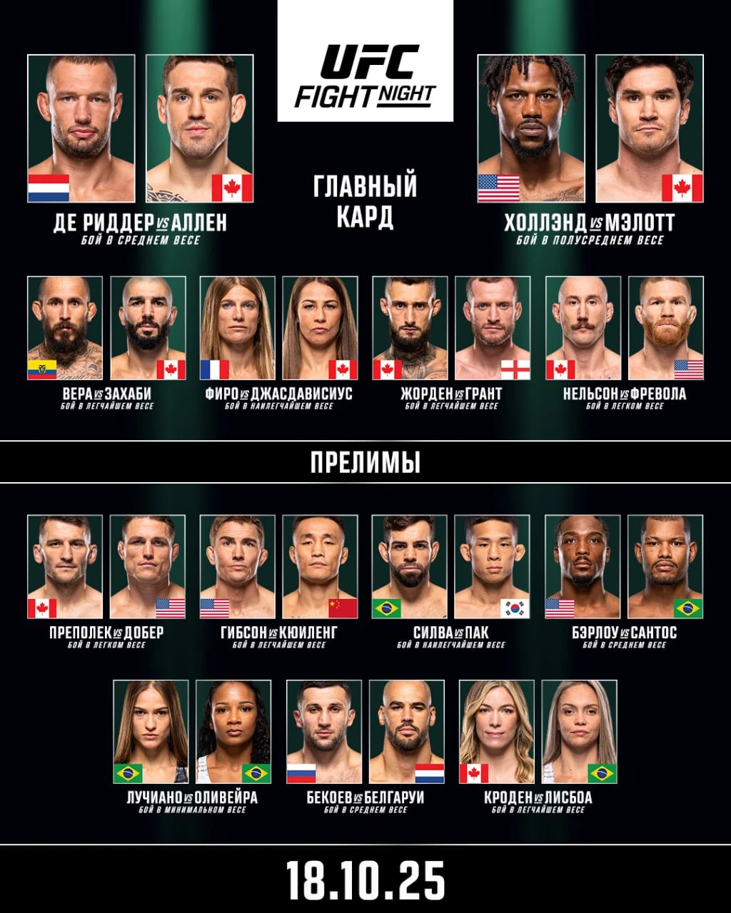 В ночь с 18 на 19 октября в Ванкувере (Канаде) пройдет турнир UFC Fight Night с главным боем Реннье Де Риддер – Брендан Аллена, сообщает Prosports.kz