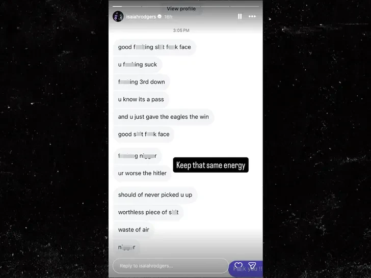 Роджерс – подписавший двухлетний контракт с «Миннесотой» в межсезонье – опубликовал эти мерзкие личные сообщения в сторис Instagram. В переписке человек написал: «ты, черт возьми, отстой», после того как защитник проиграл эпизод на третьем дауне, который в итоге принес действующим чемпионам Супербоула победу.
