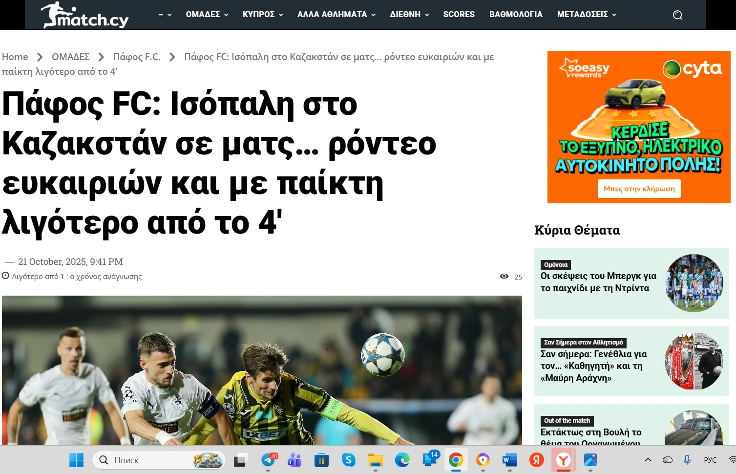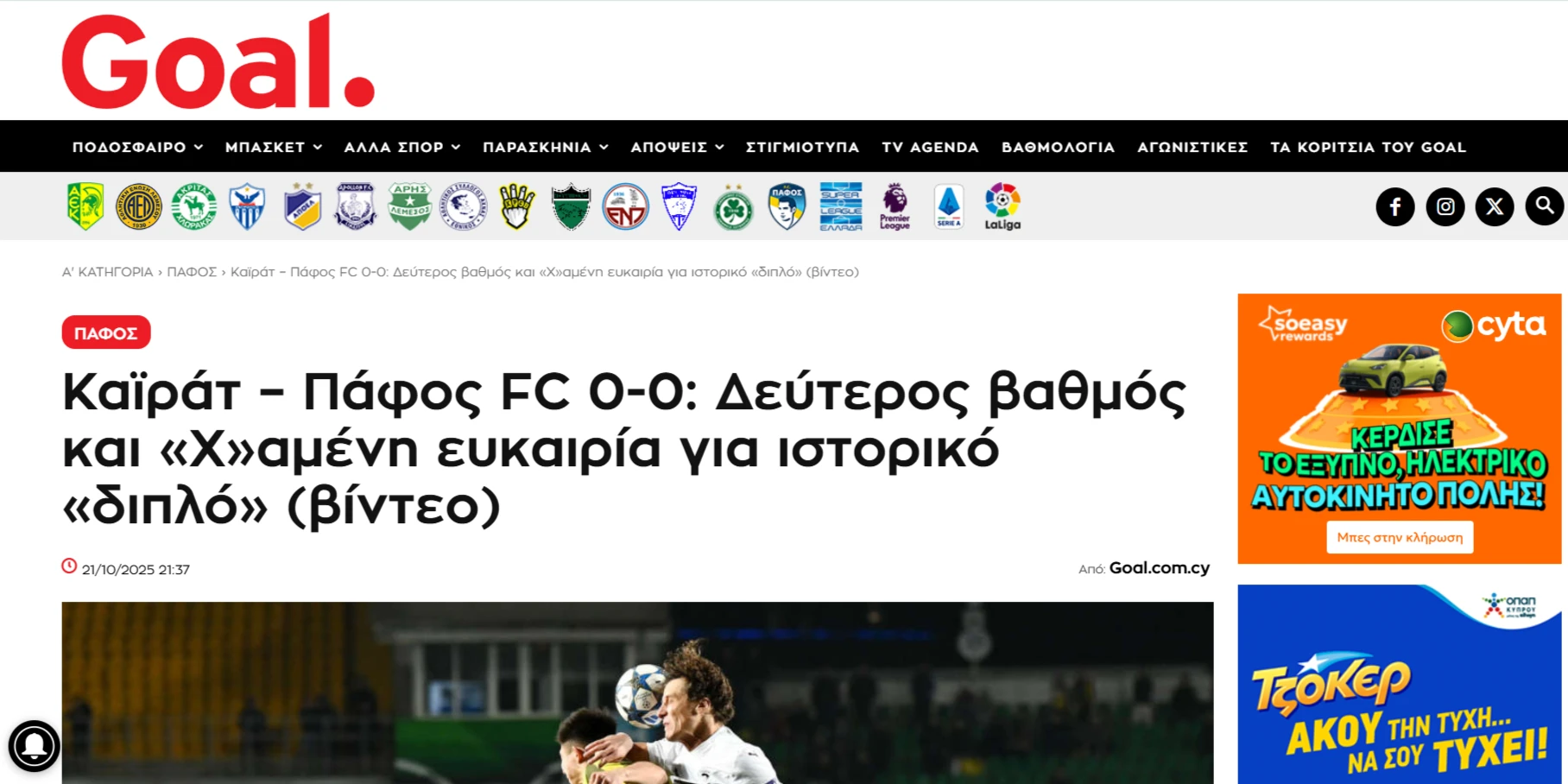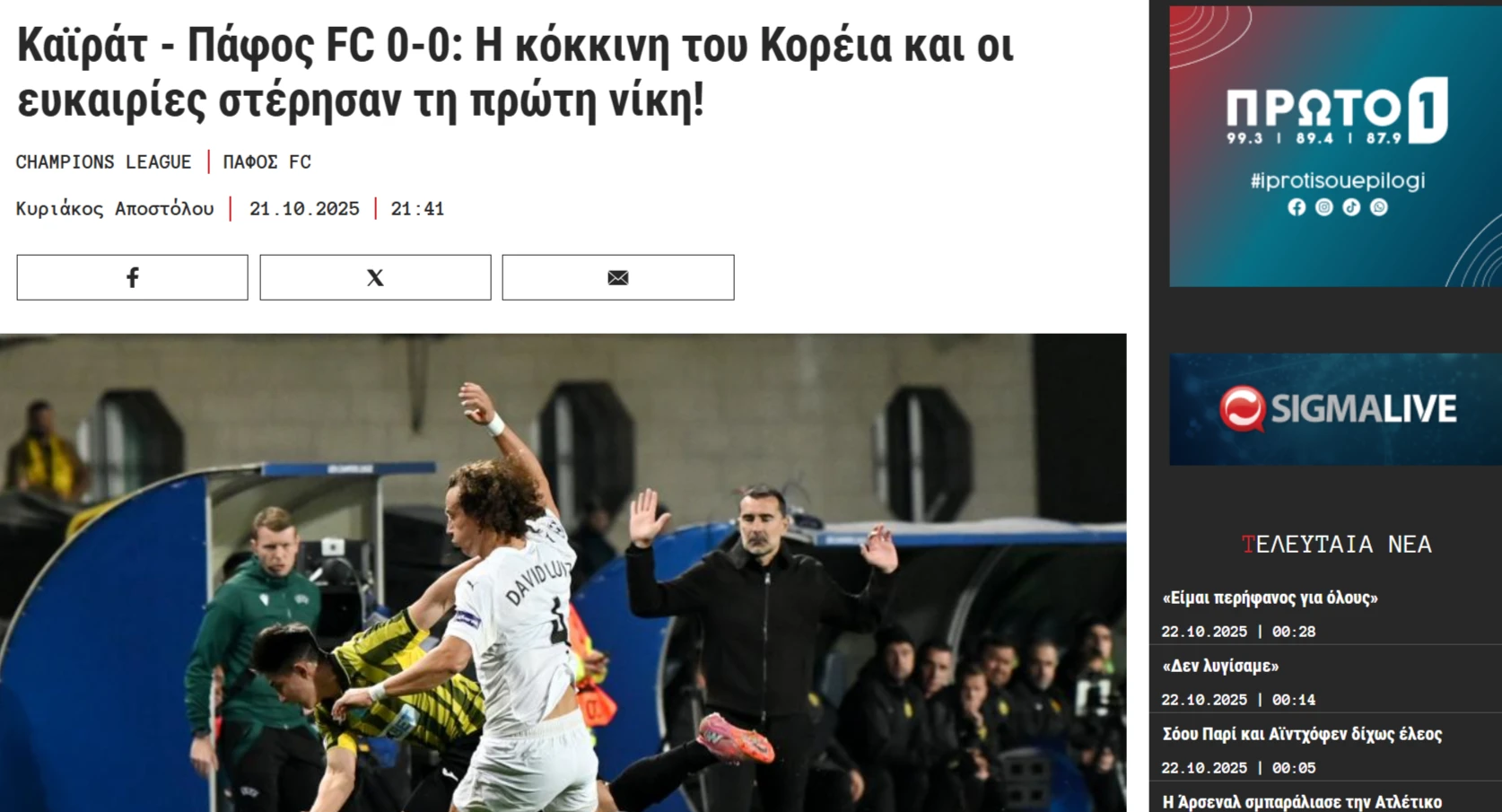 «ФК «Пафос»: Ничья в Казахстане… родео моментов, и на игрока меньше с 4 минуты», констатирует кипрский Match. ««Пафос» сыграл вничью 0:0 с «Кайратом» на алматинском стадионе «Орталык» в рамках своего матча третьего тура Лиги Чемпионов. Стартовые минуты первого тайма не были чем-то особенным: обе команды пытались… психологически проверить соперника. Ситуация изменилась очень быстро, уже на 4 минуте, когда «Пафос» остался на одного игрока меньше из-за удаления Корреа с прямой красной карточкой за то, что он высоко поднял ногу и ударил Луиша Мату. Логично, что после удаления инициатива в атаке перешла к казахам, а «Пафос» закрывал зоны и оборонялся».