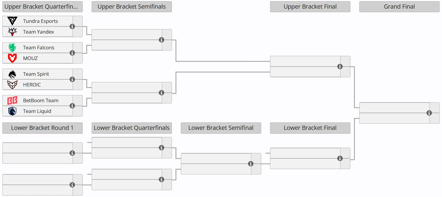 В первом раунде плей-офф BetBoom Team встретится с Team Liquid, Team Spirit сыграет против Heroic, Team Falcons — с MOUZ, а Tundra Esports — с Team Yandex. Начало матчей запланировано на 28 октября в 14:00 по Астане.