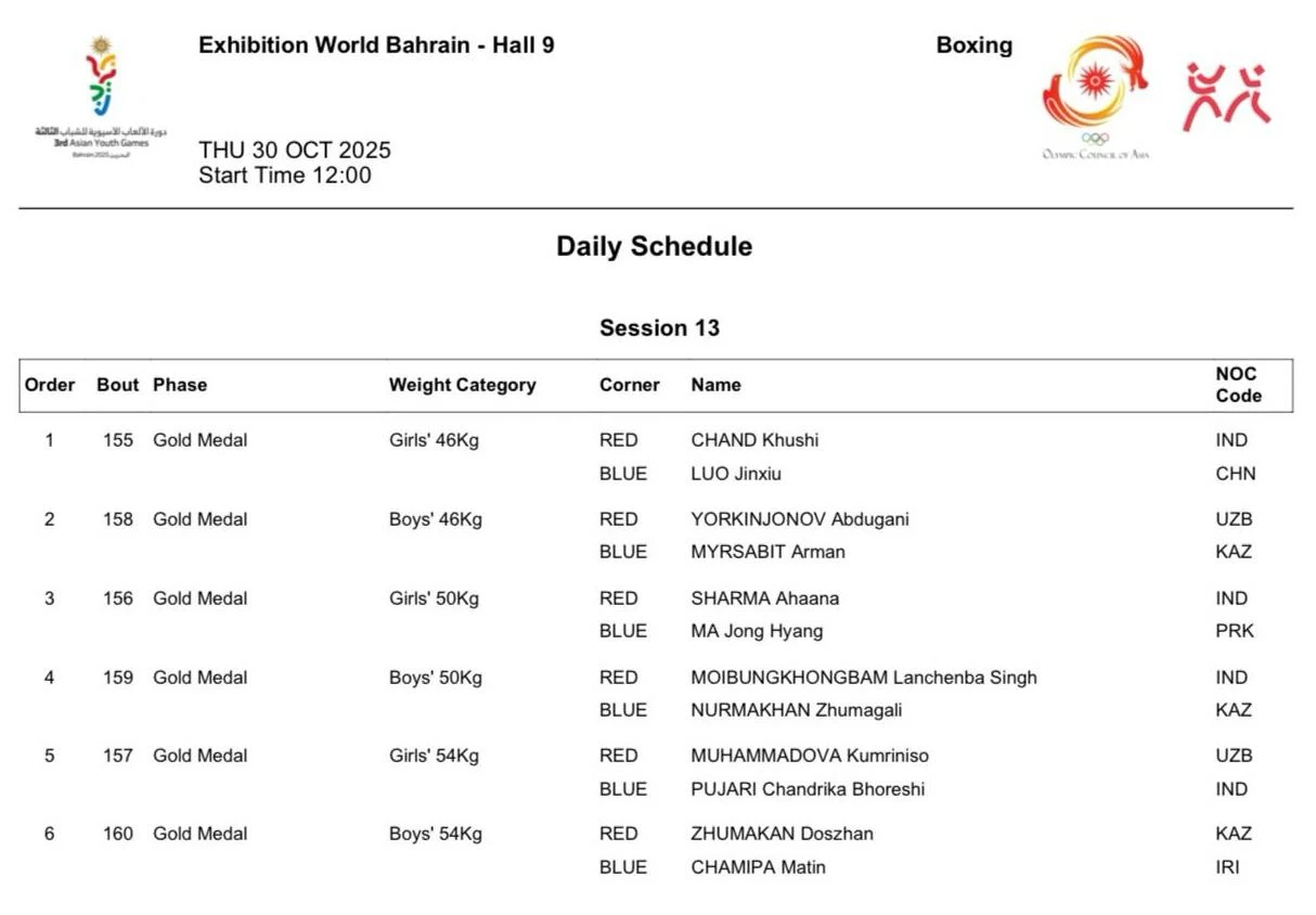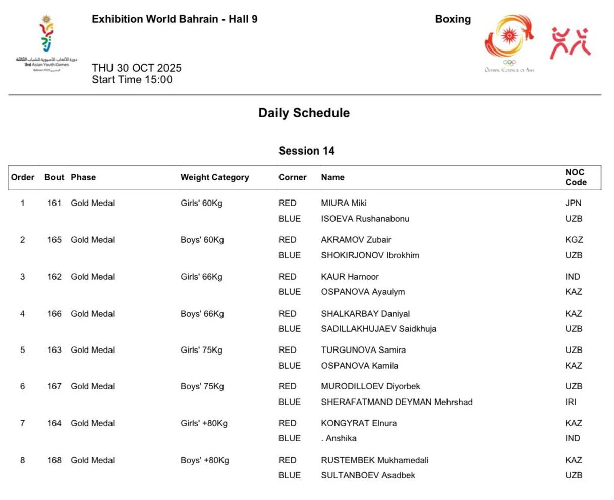 Дневная сессия стартует в 14:00, вечерняя — в 17:00 по времени Бахрейна. Финалы пройдут в 16 весовых категориях, включая четыре очных противостояния Казахстана и Узбекистана.