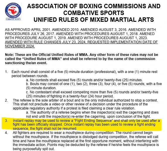 «Instant replay может быть использован для просмотра финальной сцены боя и только после официальной остановки боя. После использования повтора для просмотра сцены боя возобновление боя запрещено».