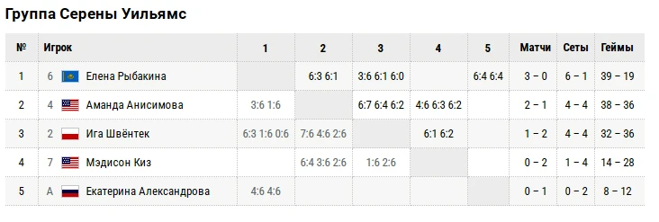 Елена Рыбакина выиграла все три матча предварительного этапа в группе Сирены Уильямс и стала первой полуфиналисткой Итогового турнира.