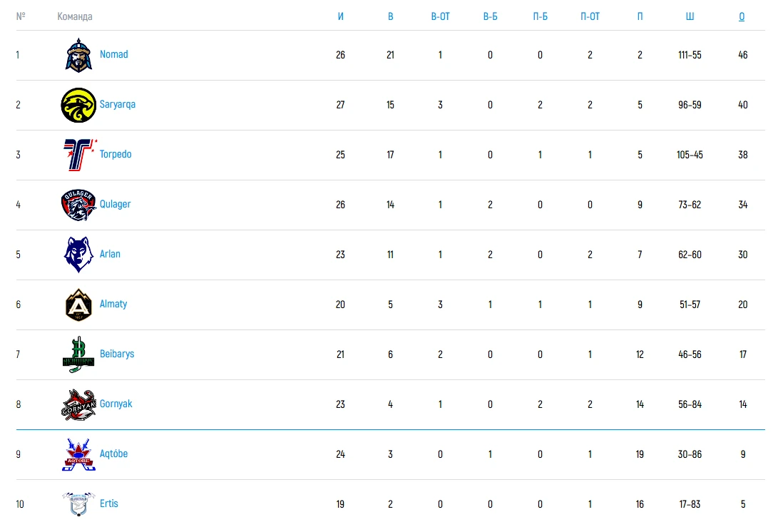 Pro Hokei Ligasy. Положение команд на 10 ноября