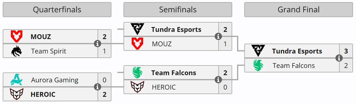 Первая карта осталась за «Соколами» — 31:9. Оливер skiter Лепко впервые с 2018 года сыграл на Venomancer и завершил матч с показателем 9-1-13. Однако на второй карте Tundra ответила победой 40:20. Иван Pure Москаленко на Faceless Void продемонстрировал KDA 13-1-17.