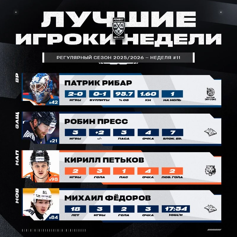 Комиссия по определению лучших хоккеистов представила лауреатов 11-й недели Чемпионата КХЛ сезона-2025/2026 в четырех ключевых номинациях, сообщает Prosports.kz.