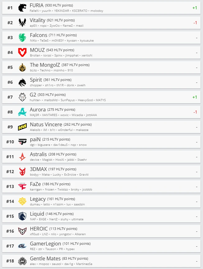 FURIA впервые за девять лет существования организации поднялась на первую строчку рейтинга HLTV, обогнав Vitality на 9 очков и закрепившись в топе благодаря стабильным результатам, передает Prosports.kz.