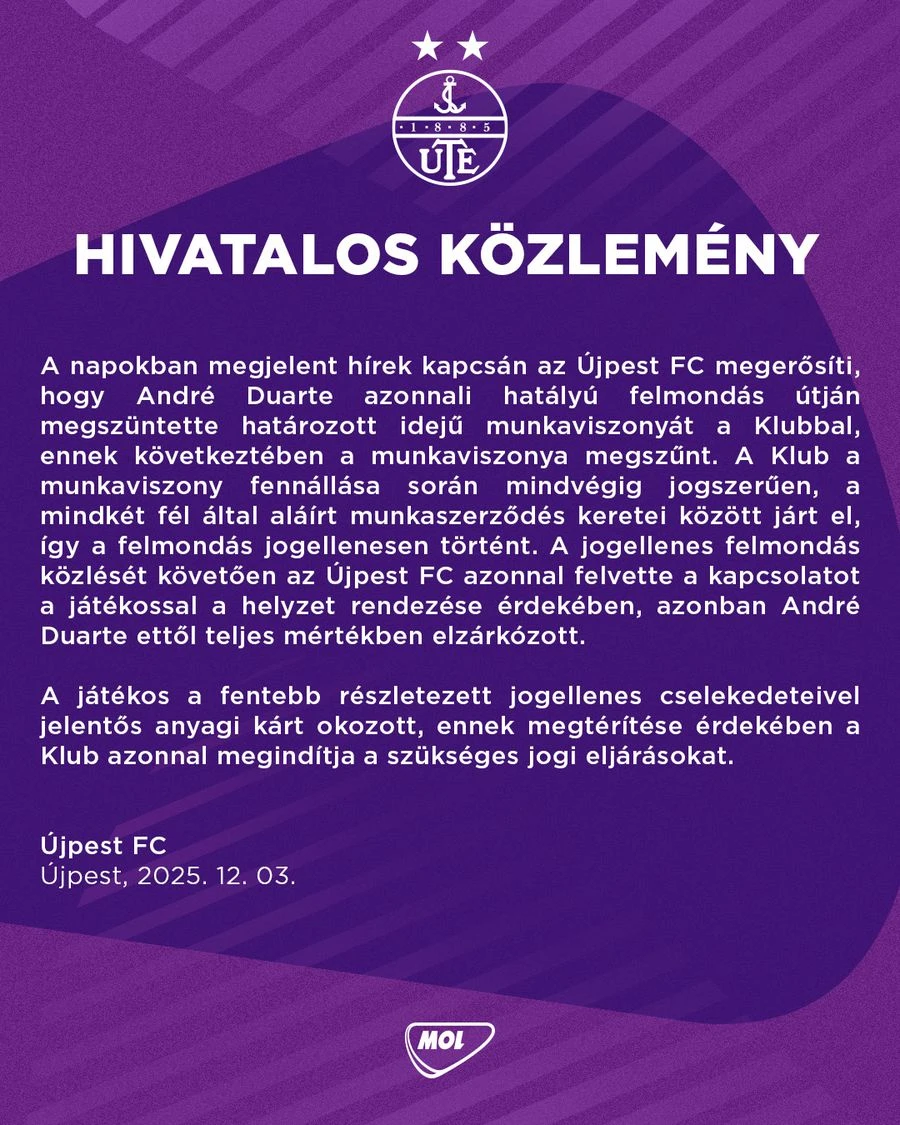 «В связи с опубликованными в последние дни новостями футбольный клуб «Уйпешт» подтверждает, что Андре Дуарте расторг контракт с клубом с немедленным вступлением в силу, в результате чего трудовые отношения были прекращены.