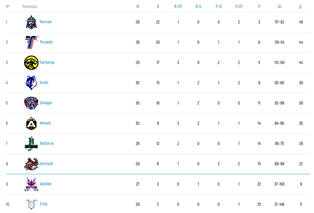 Pro Hokei Ligasy. Положение команд на 6 декабря
