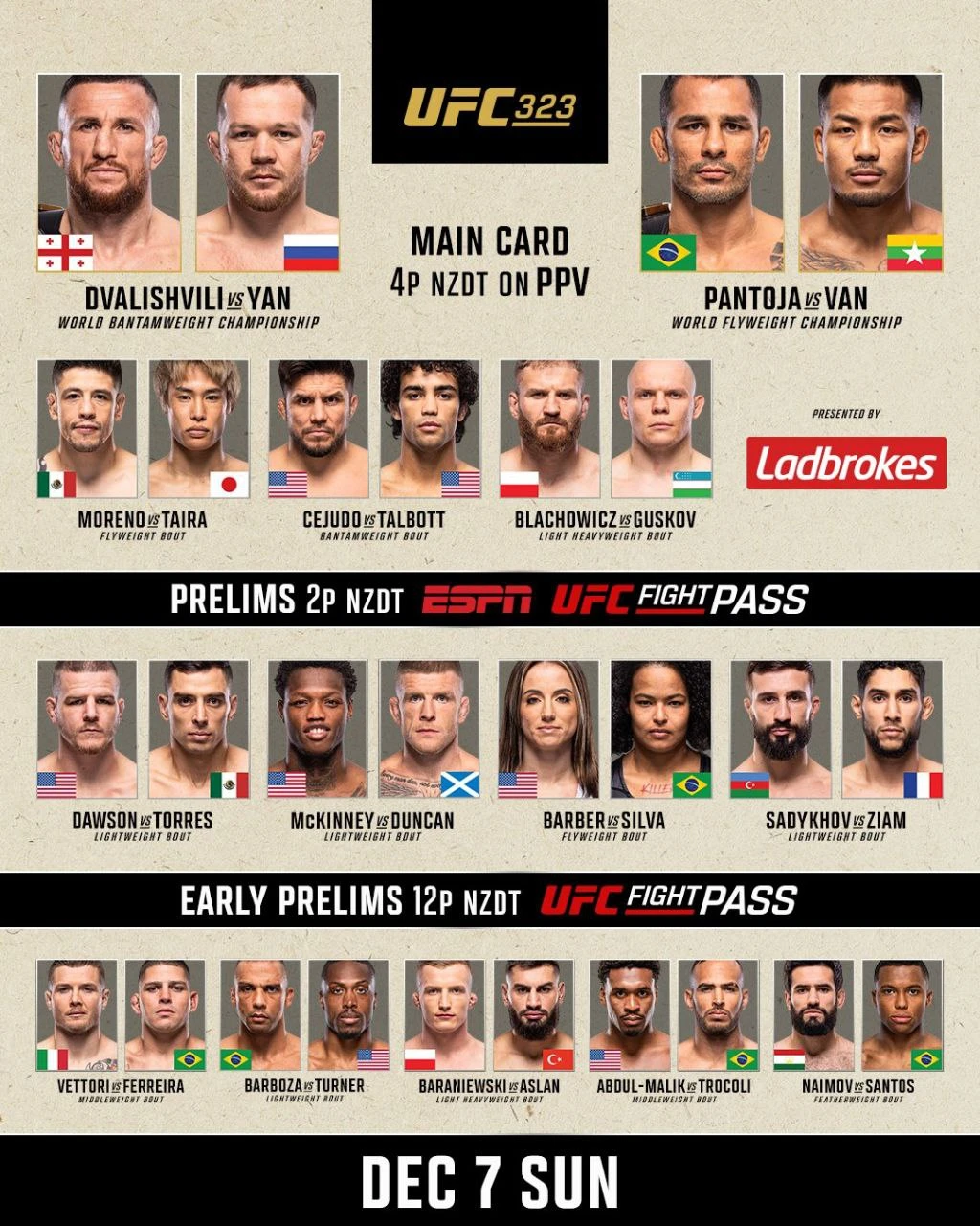 Начало турнира стартует в 04:00 (02:00 Мск) 7 декабря по казахстанскому времени, а главный кард в 08:00 (06:00 Мск).