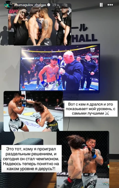 «Вот с кем я дрался, и это показывает мой уровень - с самыми лучшими! Это тот, кому я проиграл раздельным решением, и сегодня он стал чемпионом. Надеюсь, теперь понятно, на каком уровне я дерусь?!», написал Жумагулов в сторис на своей странице в Instsgram.