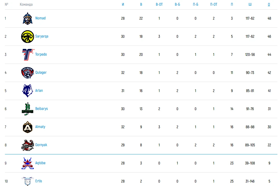 Pro Hokei Ligasy. Положение команд на 8 декабря