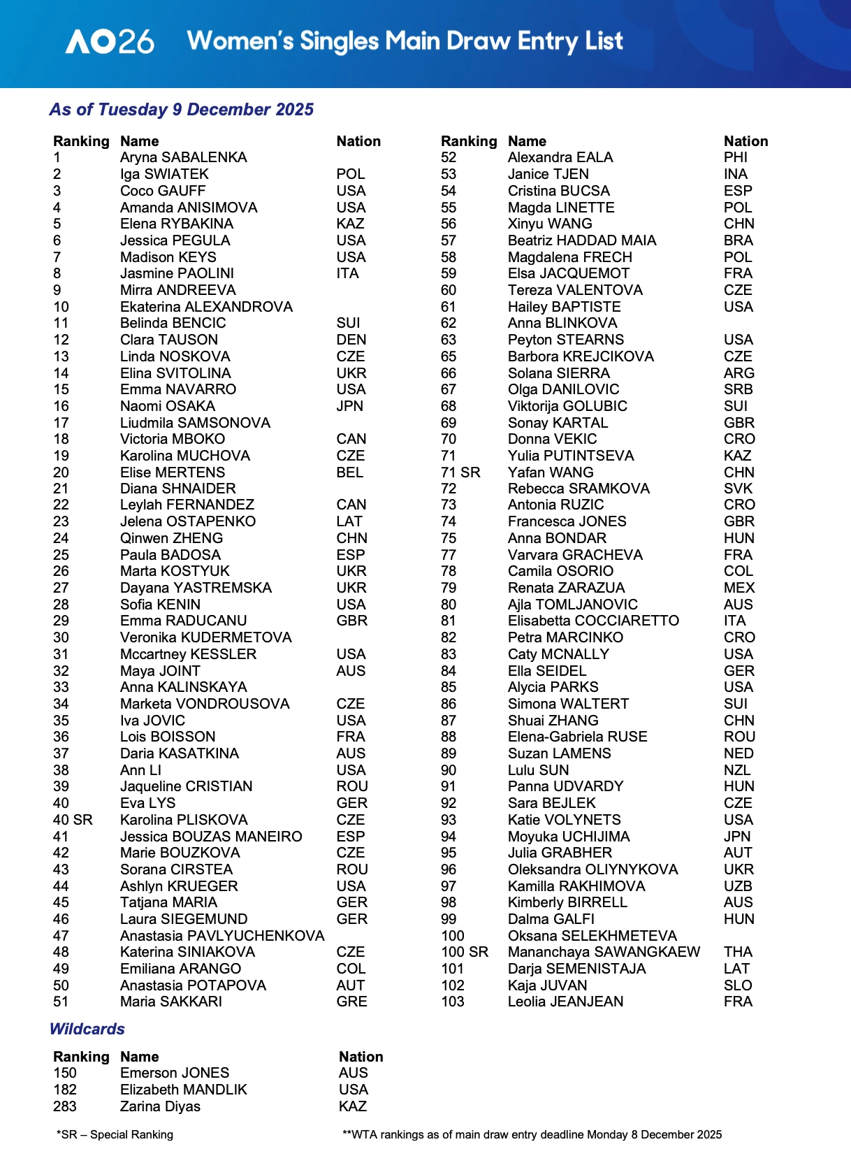 Полная заявка Australian Open — 2026: