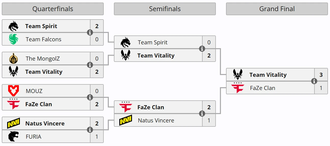 FaZe начали матч с уверенной победы на Nuke (13:6), однако далее инициативу полностью перехватила команда Дэна apEX Мадесклера. Vitality доминировала на Dust2 (13:3), Inferno (13:9) и Overpass (13:2), не оставив сопернику шансов на камбэк.