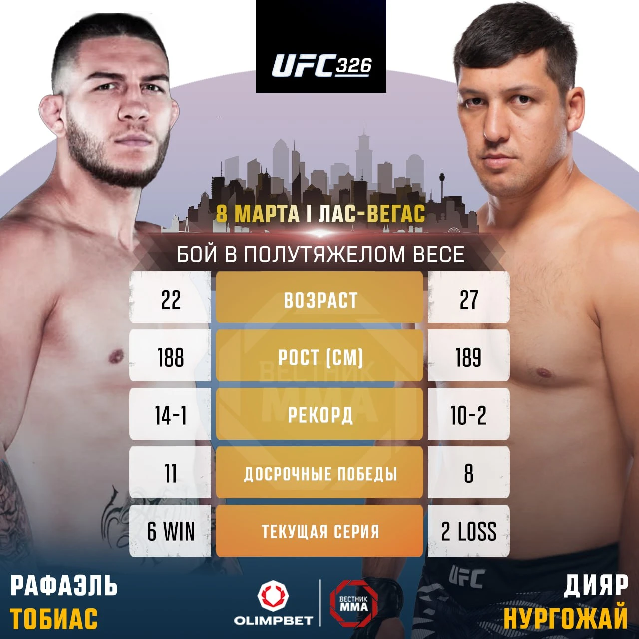 Бой пройдет в рамках турнира UFC 326, который состоится в ночь с 7 на 8 марта на арене T-Mobile в Лас-Вегасе, передает Prosports.kz.