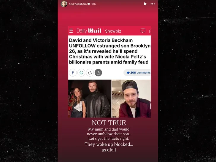 В воскресенье утром Круз опубликовал в Instagram пост, в котором опроверг слухи о том, что Виктория и Дэвид Бекхэм отписались от своего старшего сына, написав «НЕПРАВДА» и прикрепив скриншот.