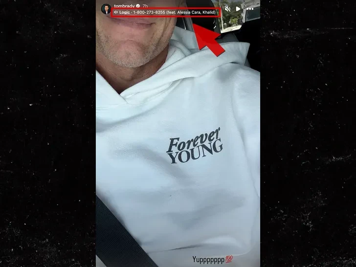 Вот в чем дело: бывший игрок НФЛ поделился двумя фотографиями в своей истории в Instagram в субботу утром – на первой из них TB12 изображен в белой толстовке с надписью «Forever Young» на груди. Хотя это всего лишь фотография, Брэди добавил к посту аудио… песню «1-800-273-8255» от Logic с участием Алессии Кары и Халида.
