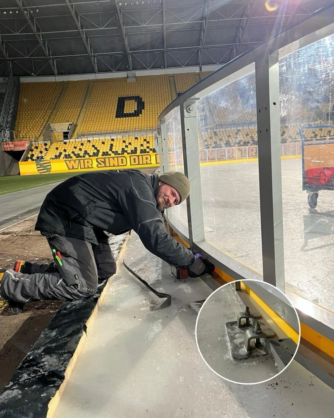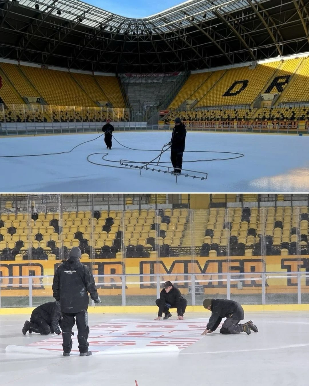 Превращение в хоккейную арену идет полным ходом — как внутри, так и снаружи. Пока в зале для пресс-конференций наносится фирменная символика, на самой арене кипит работа по подготовке льда.