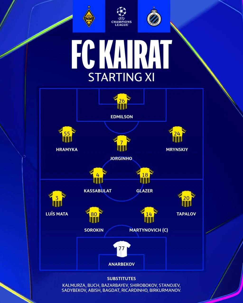 «Кайрат» объявил состав на матч с «Брюгге»