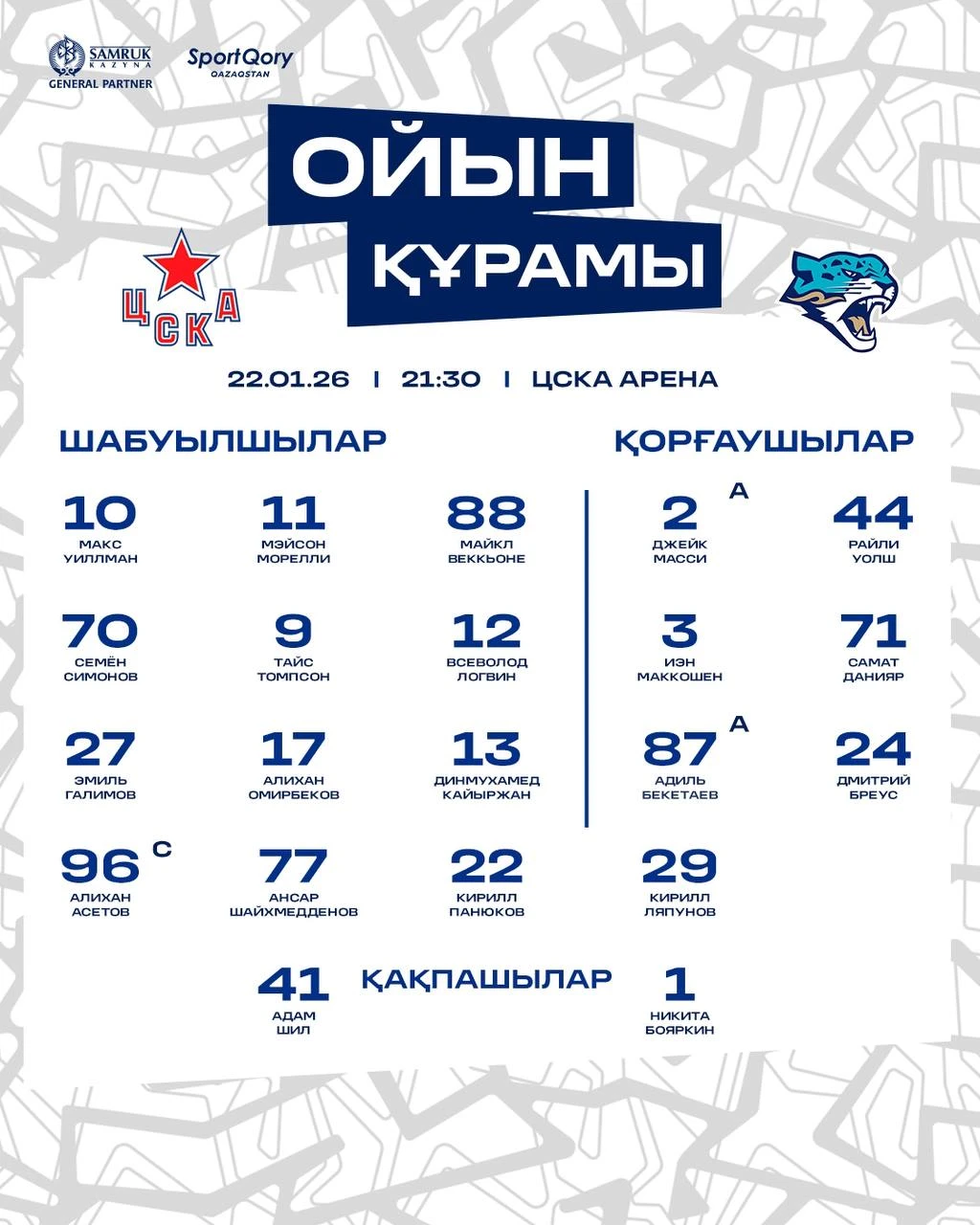Тренерский штаб «Барыса» из Астаны объявил стартовый состав на гостевой матч против ЦСКА в Москве.