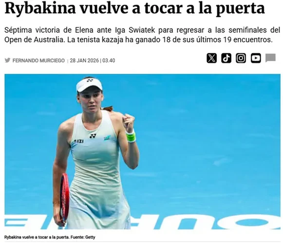 «Победа Елены Рыбакиной над Игой Швентек обеспечила ей место в полуфинале Открытого чемпионата Австралии. Казахстанская теннисистка выиграла 18 из последних 19 матчей. Рыбакина в отличной форме. В среду она столкнулась со своим первым серьезным испытанием на Открытом чемпионате Австралии в этом году. Второй сет был настолько легким, что Швентек даже не дергалась; она сразу же признала поражение, завершив таким образом свой первый турнир в этом году», добавляет puntodebreak.com.