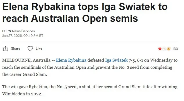 «Елена Рыбакина победила Игу Швентек со счетом 7-5, 6-1 в среду и вышла в полуфинал Открытого чемпионата Австралии, помешав второй сеяной теннисистке выиграть Большой шлем для своей карьеры. Благодаря этой победе Рыбакина, посеянная под пятым номером, имеет шанс взять свой второй титул Большого шлема после победы на Уимблдоне в 2022 году», рассказывает ESPN.