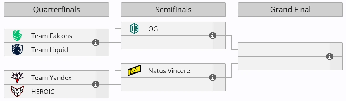 Ранее через стадию Play-In в плей-офф также вышли Team Yandex, Team Falcons и HEROIC. В полуфиналах их уже ожидают лучшие коллективы группового этапа — OG и NAVI.