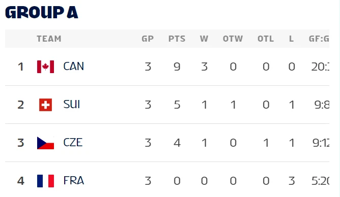 Напрямую в четвертьфинал вышли сборные Канады, США, Словакии и Финляндии.