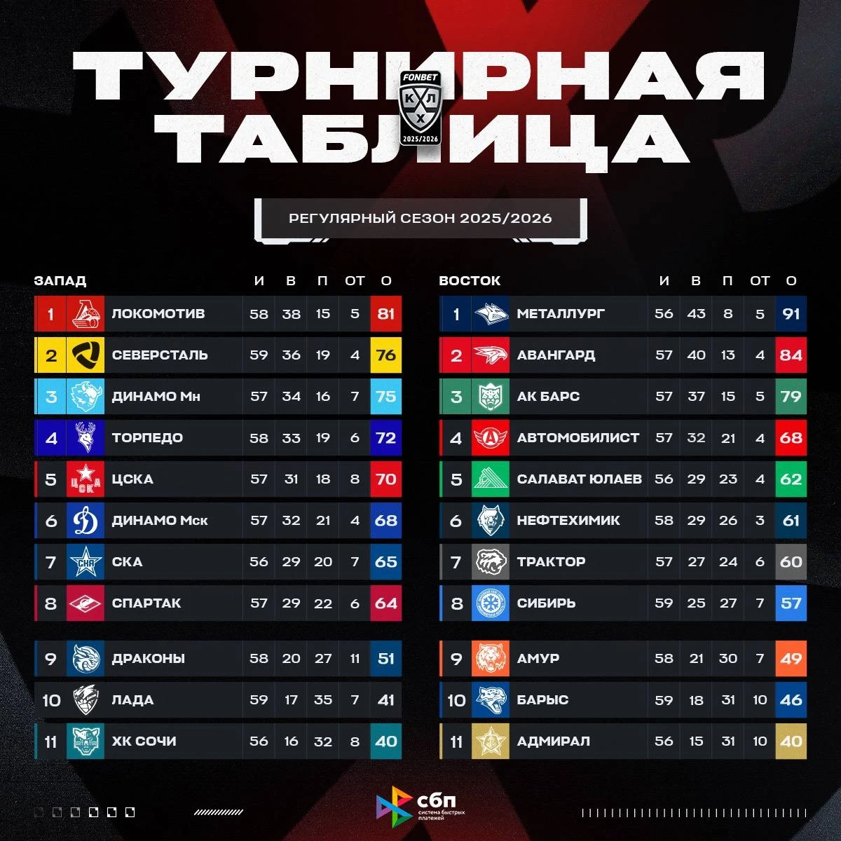 Континентальная хоккейная лига (КХЛ) представила актуальное турнирное положение команд, сообщает Prosports.kz.