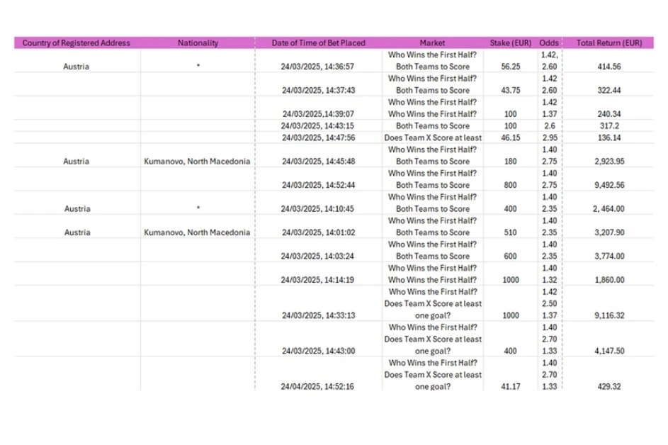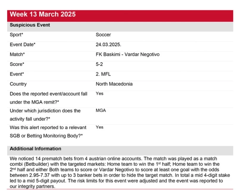 Согласно документам, австрийские букмекеры получили сигнал о нетипичном увеличении выплат по результату матча прошлого сезона Второй македонской футбольной лиги. Речь идет о поединке между «Башкими» и «Вардаро» (Неготино), сыгранном 24 марта 2025 года, который завершился победой хозяев со счетом 5:2.