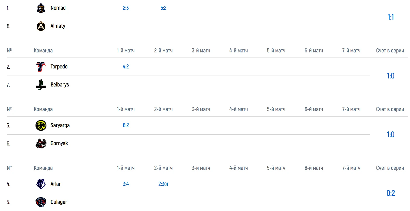 В завершившемся регулярном чемпионате «Сарыарка» выиграла у «Горняка» пять матчей из шести - 5:3, 3:1, 4:3 ОТ, 4:0, 1:3, 4:1.