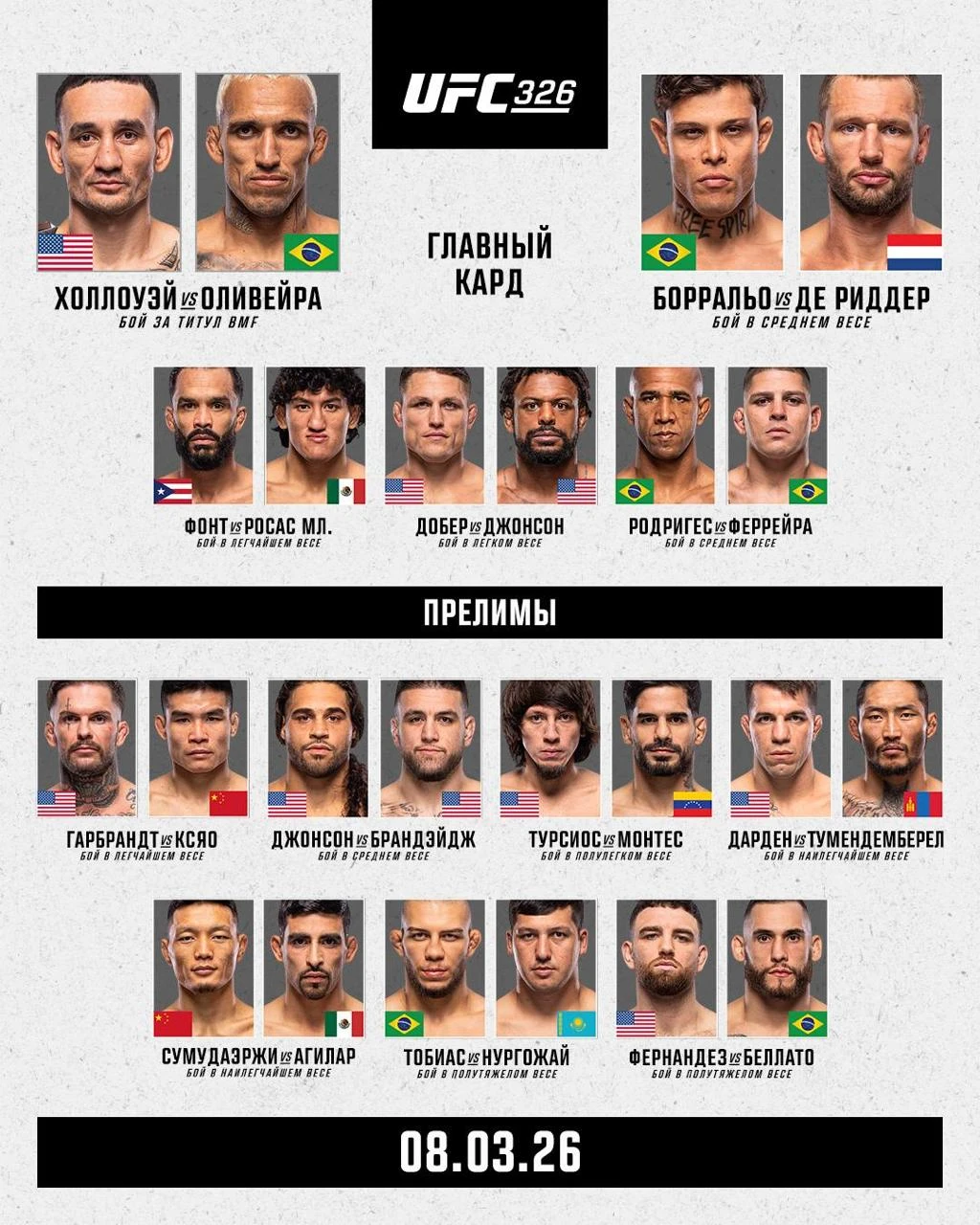 Турнир UFC 326 стартует в 03:30 по казахстанскому времени, а начало главного карда запланировано на 07:00 (05:00 Мск).