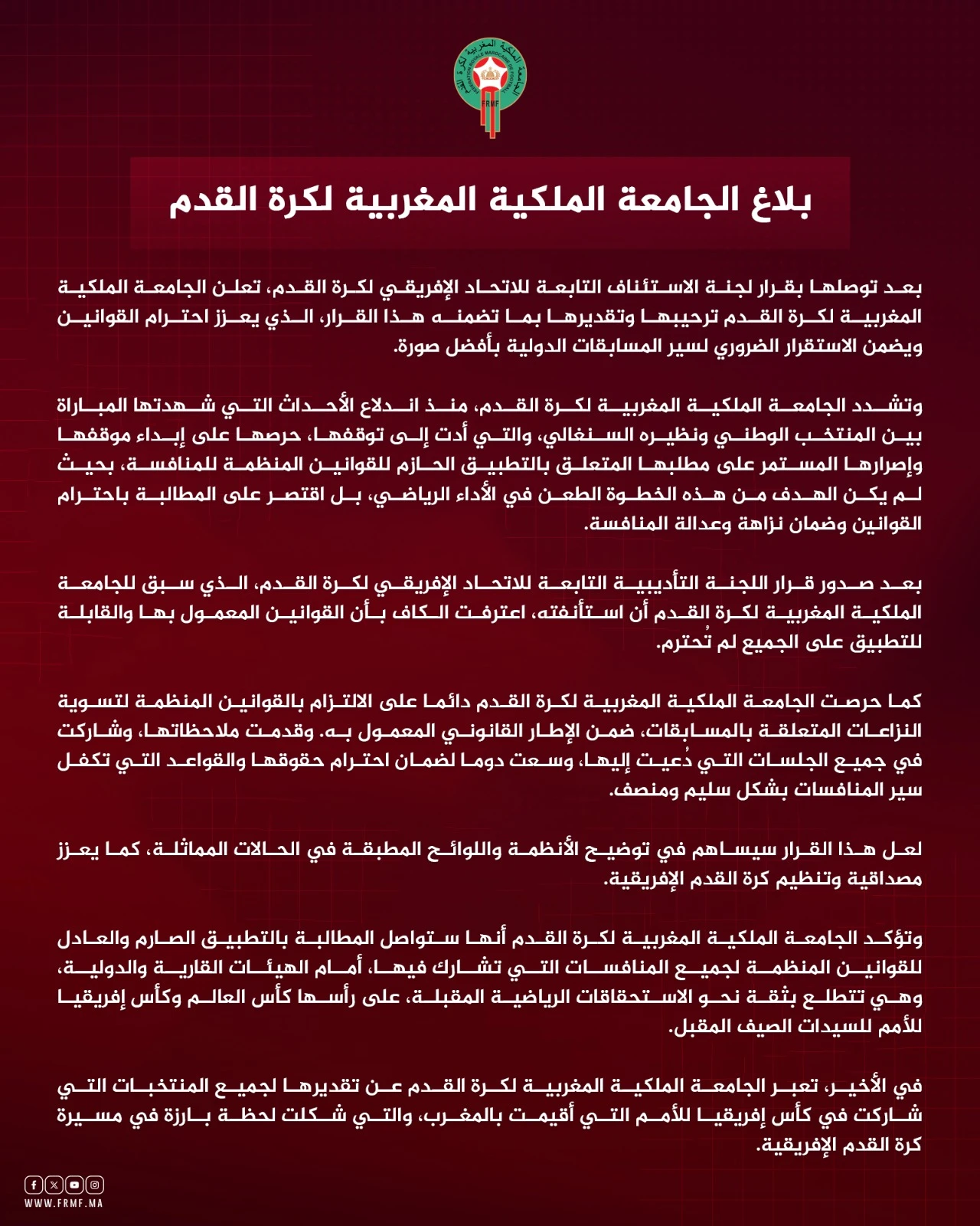Это решение вносит ясность и еще больше укрепляет доверие к международным соревнованиям, особенно в африканском футболе», уверены футбольные власти Марокко.