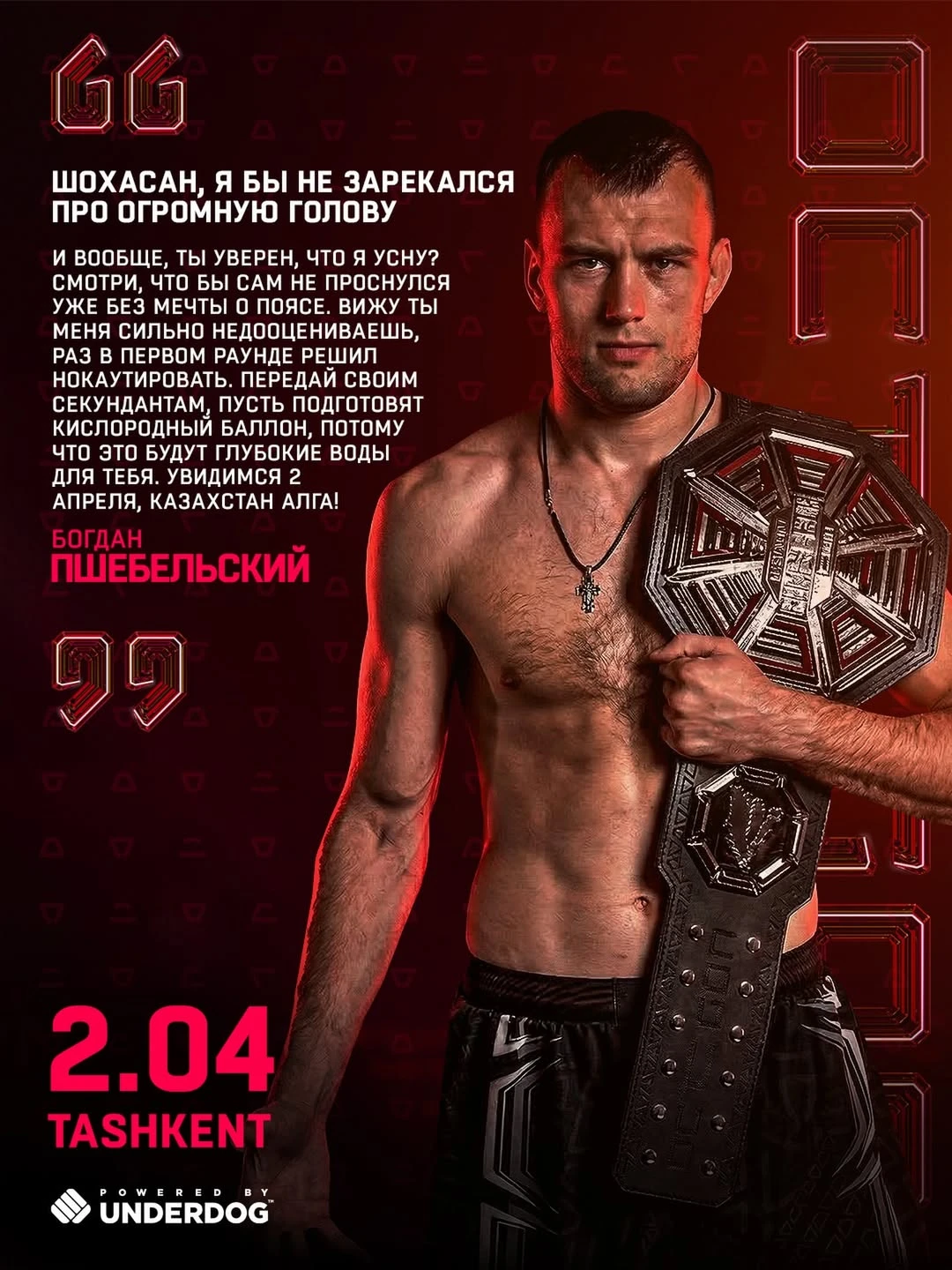 Чемпион полусреднего веса лиги OCTAGON казахстанец Богдан Пшебельский (7-2) ответил на выпад узбекской «хайлайт-машины» Шохасана Мирзаматова (16-2), с которым ему предстоит провести защиту титула 2 апреля в Ташкенте, пишет Prosports.kz со ссылкной на официальный аккаунт Центрально-Азиатской бойцовской лиги.