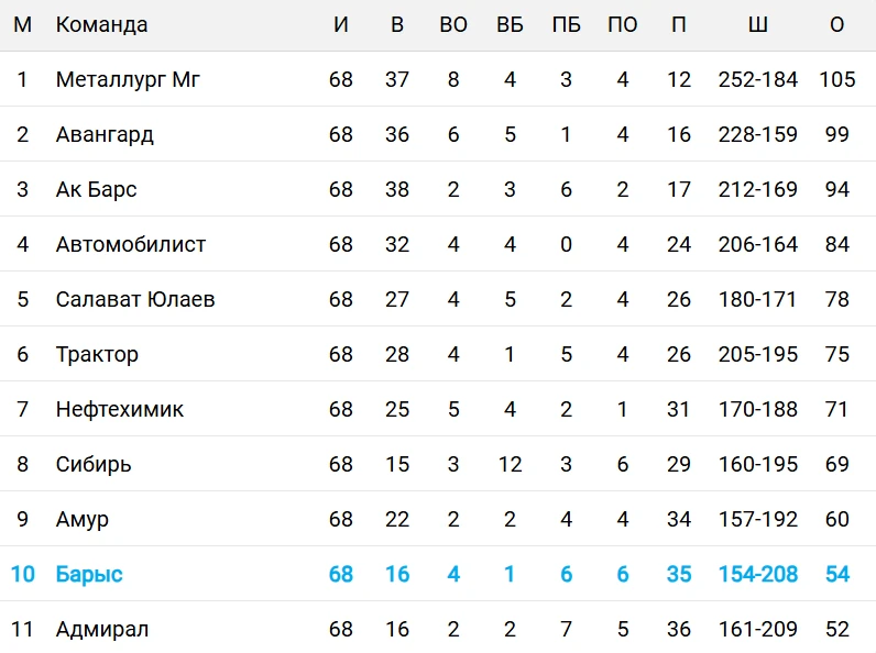 Завершился регулярный чемпионат КХЛ сезона-2025/2026, по итогам которого «Барыс» не сумел пробиться в плей-офф, передает Prosports.kz.