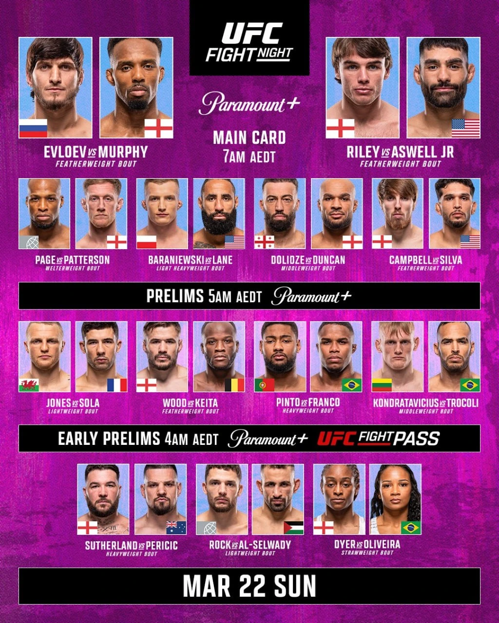 В главном событии турнира состоится ожидаемый болельщиками поединок в полулегком весе между непобежденным российским файтером Мовсаром Евлоевым (19-0) и британцем Лерон Мерфи (17-0-1).
