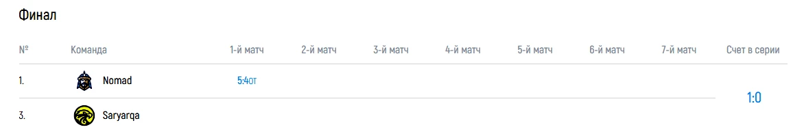 Чемпион страны определится в серии до четырех побед. Преимуществом своего льда будет владеть «Номад». Астанчане выиграли первый матч финала (5:4 ОТ) и ведут в противостоянии1-0.